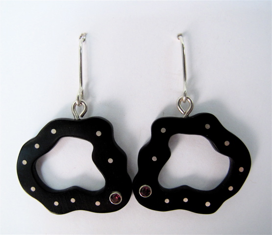 Order of sequence BettyMcKim, sterling silver scalloped circle drop, still working out the kinks on this design. Lillian Jones granulation with enamel. Suzanne Krill, plexiglass and gemstone, silver rivets. Julie Brooks "Princess Leas" series, one pair is from week 27. The geometric linear simplicity of Megan Clark.